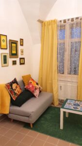 Vor dem Fenster ist eine kleine Couch mit Couchtisch zum Entspannen. Der W-LAN Router befindet sich in der Ecke hinter der Tür.
