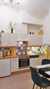 Die Wohnküche bildet das Herz der Wohnung. Die Küchenzeile ist voll ausgestattet mit einem Kühlschrank mit Eisfach, Backofen, Cerankochfeld, Dunstabzug, Geschirrspüler, Wasserkocher, Nespresso-Kaffeemaschine sowie Geschirr und Besteck.