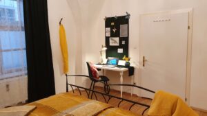 Genug Stauraum findest du in den Schränken und der Kommode. Dort befindet sich auch das Bügeleisen und Bügelbrett sowie der Wäscheständer. Um Sachen aufzuhängen findest du eine Hakenleiste an der Tür und weitere Haken zwischen Schreibtisch und Fenster.