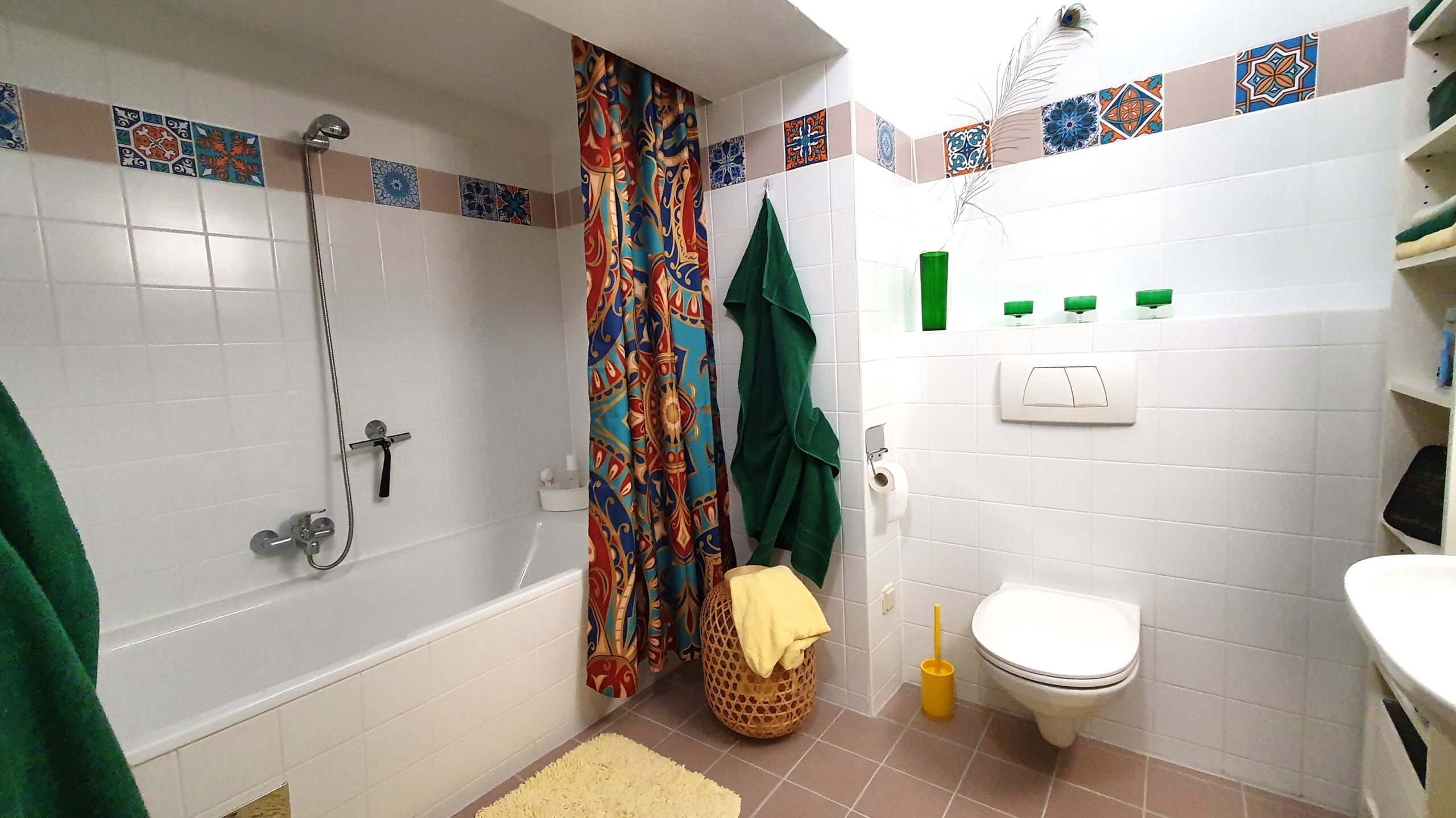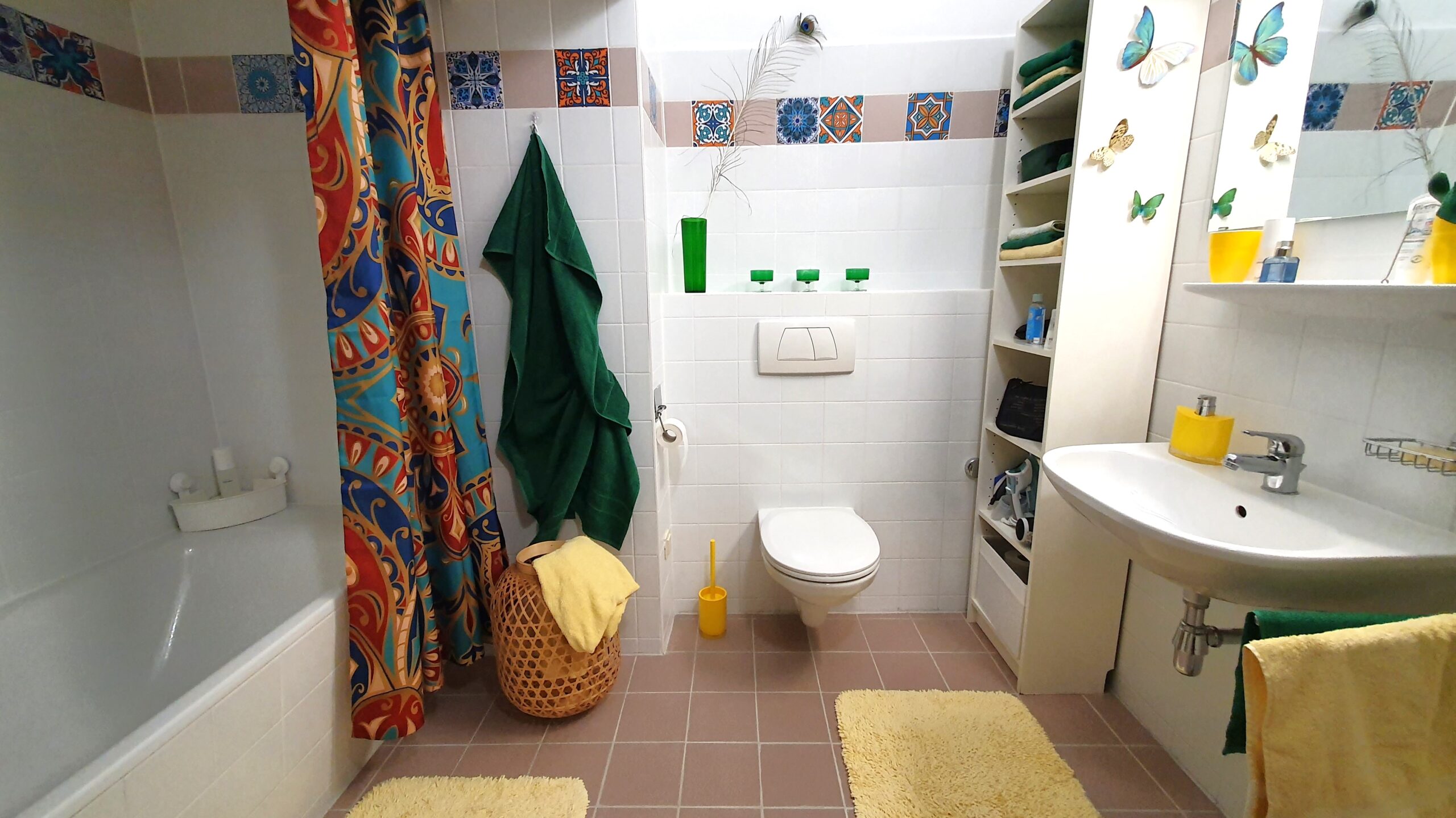 Zwischen Badewanne und WC steht die Waschmaschine. Diese bietet ebenso Ablagefläche wie der Sims über der Toilette und das Regal. Dort findest du auch einen Fön.