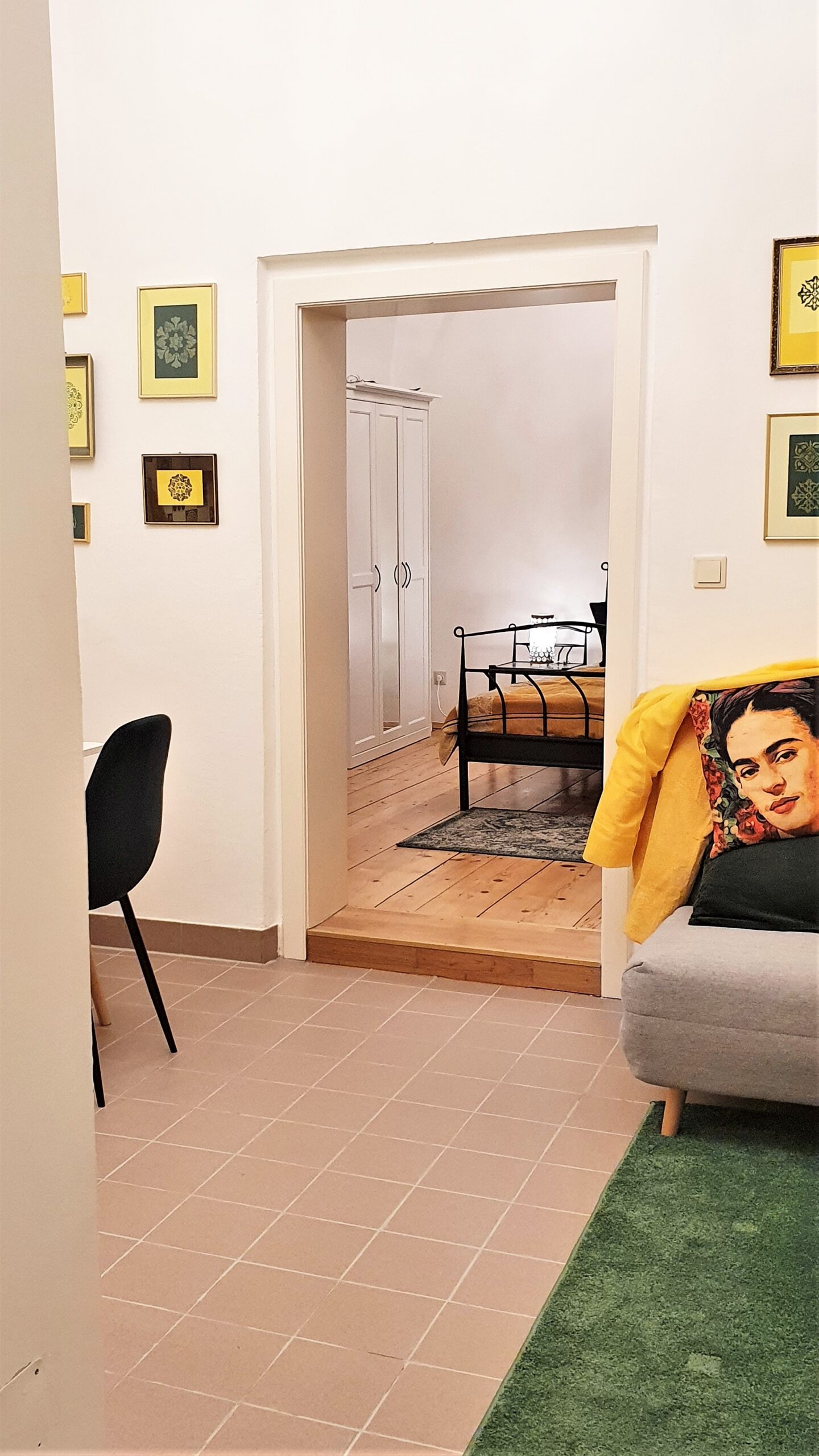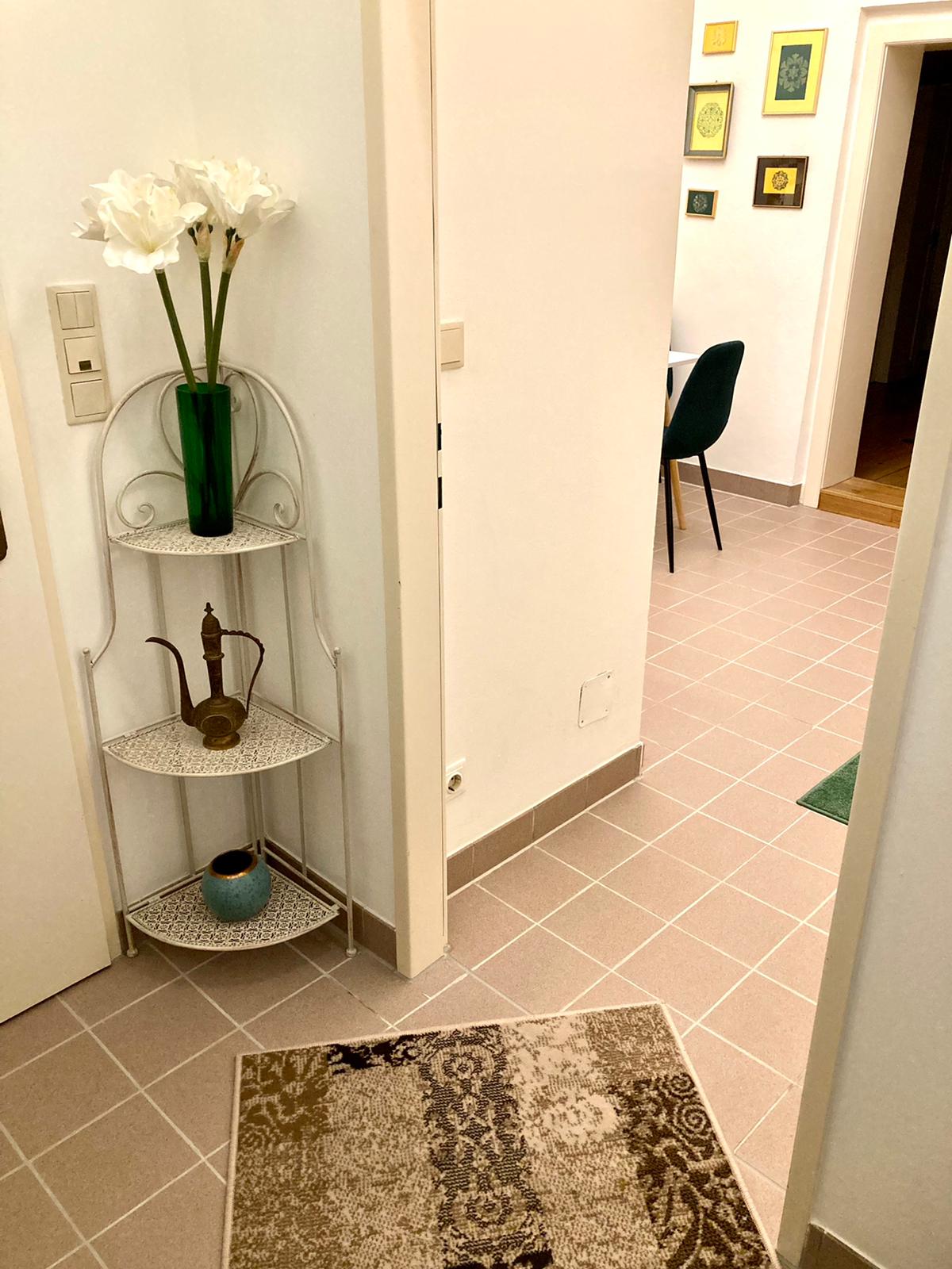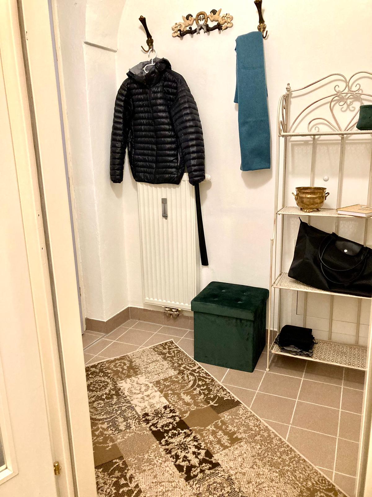 Der Flur ist klein. Trotzdem findest du dort eine Garderobe, einen Hocker und zwei Regale. Dort befindet sich auch eine Gästemappe mit Infos und viele Prospekte, Broschüren und Stadtpläne. Für nasse Tage stehen zwei Regenschirme zur Verfügung.
