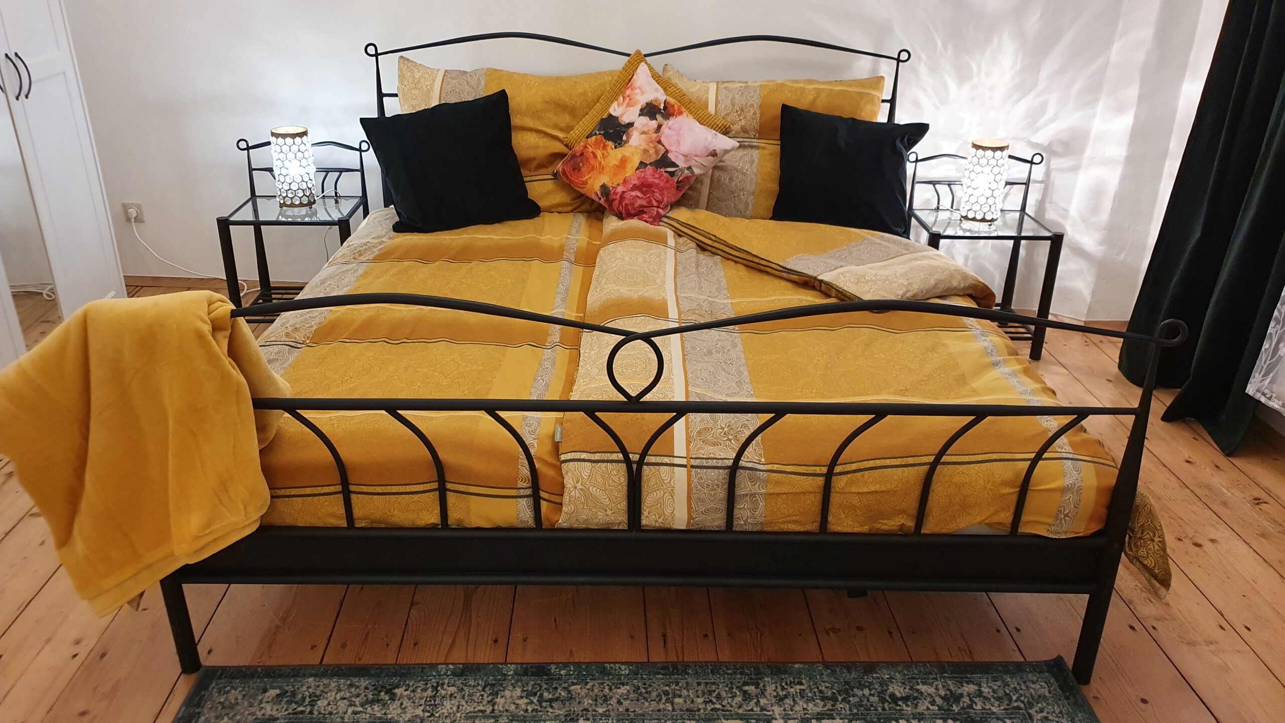 Im Schlafzimmer erwartet dich ein großes Doppelbett mit zwei Nachttischen.