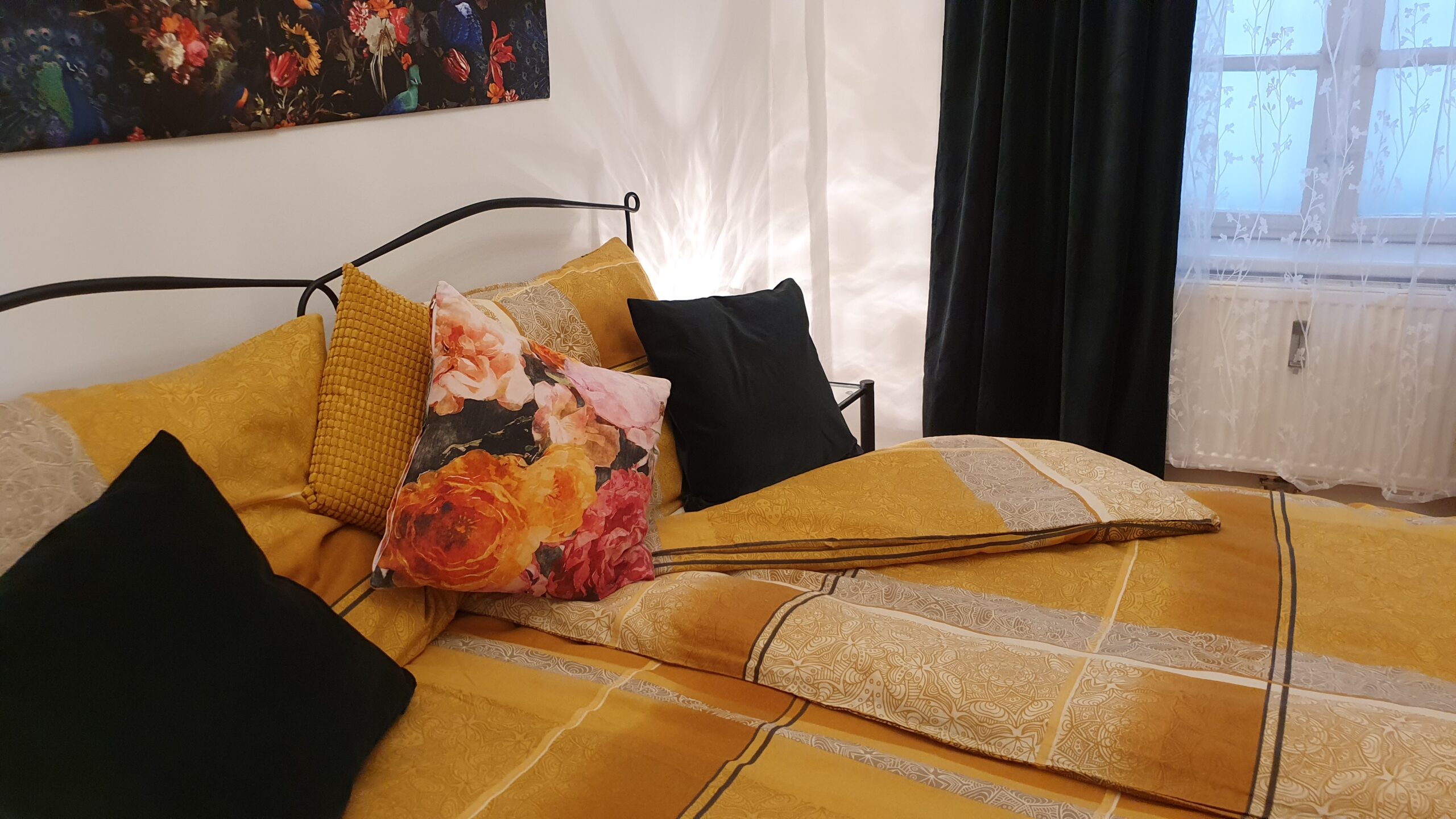 Die langen, dunklen Samtvorhänge ermöglichen eine gute Verdunkelung.
